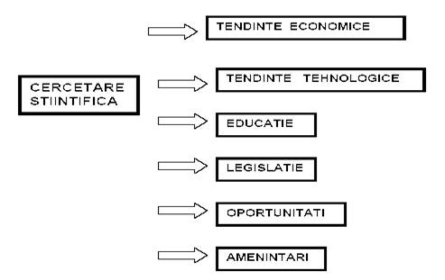 Un studiu de evaluare a cercetarii trebuie sa tina seama de tendintele economice, tehnologice, aspectele de educatie, legislatie, oportunitati si riscuri (amenintari).