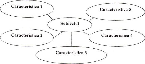 1. Alegeti un text si cereti elevilor sa-l parcurga la inceputul orei. Impartiti elevii in grupe de cate 3 - 5 si distributi planse pe care fiecare grup va reprezenta grafic continutul textului. Cereti elevilor sa reprezinte grafic caracterizarea personajului principal (daca e vorba e o povestire) sau argumentarea unei idei (daca textul are un caracter mai abstract) astfel: in centrul paginii intr-un cere se trece numele personajului (sau conceptul) ■ In cercuri satelit, asezate in jurul primului cere se scriu diferite cuvinte care caracterizeaza personajul sau ideea respectiva ■ in