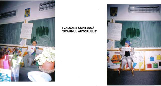 In clasele Step by Step un instrument important de evaluare este "Scaunul Autorului". Aici elevul prezinta colegilor tema efectuata de el sau de grupul de la centru la care a lucrat. Prezentarea este urmata de analiza si comentariile colegilor si invatatoarei. Acest exercitiu ii formeaza pe copii in directia intelegerii rationamentelor colegilor si de a judeca rezultatul muncii colegilor lui pe care il va compara cu munca lui. Totodata este un instrument prin care elevii invata sa comunice liber.