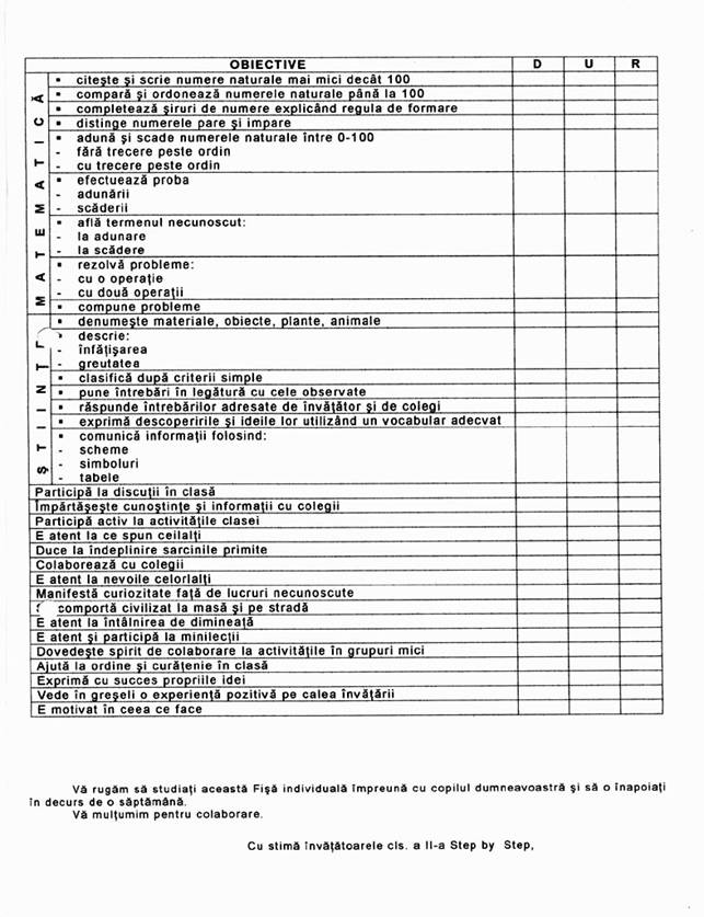 Va rugam sa parcurgeti toate materialele impreuna cu copilul, punandu-i toate intrebarile pe care le considerati necesare. Va rugam dupa aceea sa completati chestionarul alaturat. Suntem foarte interesate sa cunoastem reactiile dvs. fata de progresele in studiu ale copilului .