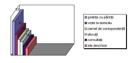 Formele de colaborare ale scolii cu familia , in ordinea preferintelor sunt urmatoarele: sedinte cu parintii, consultatii cu parintii, carnet de corespondenta, legatura prin telefon, corespondenta oficiala, vizite la domiciliu, activitati extrascolare. Intalniri organizate, regulate, au loc de 4 ori pe an cu ocazia sedintelor cu parint Prezenta parintilor la consultatii este rara pentru ca orele la care se fac sunt neadecvate pentru unii parinti, sau nu cunosc ora exacta a consultatiei, sau lipseste interesul pentru evolutia copilului. Vizitele la domiciliu au loc in majoritatea cazurilor o data pe an sau chiar niciodata. In cazul elevilor problema numarul vizitelor la domiciliu este mai mare, in functie de problemele ivite, dar se poate spune ca vizitele la domiciliu nu sunt agreate de majoritatea cadrelor didactice. In cazul elevilor cu dificultati de comportament, sau cu probleme de invatare pe langa vizitele la domiciliu sunt preferate discutiile cu parintii dupa ore sau in timpul consultatiilor cu parint Frecventa acestor intalniri este functie de frecventa neregularitatilor.