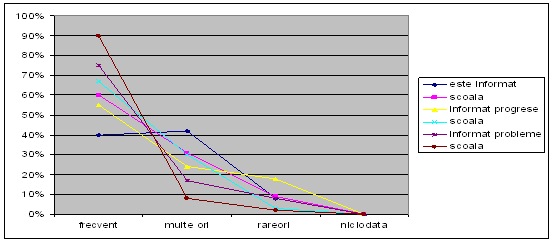 a) Primul grup de intrebari se refera la fluxul de informatii de la scoala la familie. Este de remarcat faptul ca a fost mult mai usor de identificat masura fluxului informational cand s-a exemplificat concret la ce se refera - progres sau probleme ale copilului. Atat parintii cat si cadrele didactice considera ca se realizeaza o informare foarte buna in acest sens, dar informatiile generale legate de obiective, programe, activitati, scara de valori ale scolii nu ajung in aceeasi masura la partenerul educativ al scol Este bine ca informatiile legate de copii ajung la familii, dar trebuie revizuita informarea parintilor legata de viata scolii in general. Este de remarcat ca informatiile ajung la parinti, nu in masura dorita, dar faptul ca secventa a patra a raspunsurilor - niciodata - nu a inregistrat nici un raspuns dovedeste clar preocuparea cadrelor didactice si a directiunii pentru transmiterea informatiilor tuturor partenerilor implicati in educatia copiilor, mai ales scol