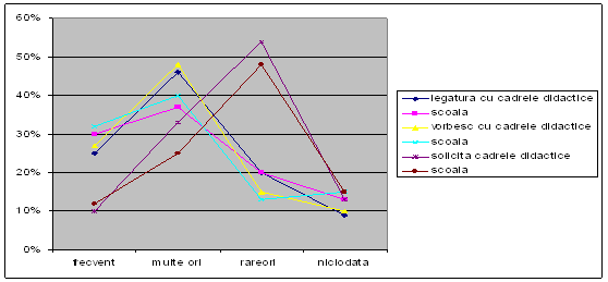 Faptul ca cele doua grafice, reprezentarea raspunsurilor parintilor si reprezentarea raspunsurilor cadrelor didactice, aproape se suprapun arata ca se cunoaste situatia comunicarii de ambele parti. Faptul ca numarul celor care tin legatura cu scoala este mai mare decat cel al celor care vorbesc cu cadrele didactice dovedeste ca discutiile nu sunt singurul mijloc de comunicare intre scoala si familie. Observand numarul celor care nu tin legatura cu scoala, nu vorbesc cu cadrele didactice corespunde procentual datelor prezentate de cadre didactice cu ocazia convorbirilor: exista cam 15% - 25% dintre parinti care lasa educatia aproape in totalitate pe umerii scolii - iar legat de cei care pastreaza frecvent legatura se confirma ca aproximativ 30% din parinti sunt foarte interesati de obtinerea informatiilor la zi. Grafic situatia este prezentata in figura 8.