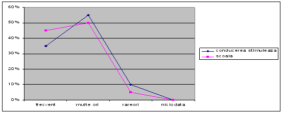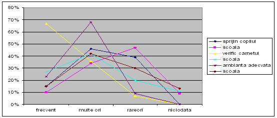 d) Setul urmator de intrebari vizeaza implicarea parintilor in viata elevilor, in asigurarea conditiilor materiale si ambientale necesare studiului elevului, atitudinea ocrotitoare, raspunzatoare fata de progresul scolar al copilului, consecventa in urmarirea rezultatelor la invatatura. Se remarca ca la nici un item nu s-a inregistrat raspunsul - niciodata -. In mod ideal s-ar concluziona ca fiecare familie se ocupa de educarea, de urmarirea consecventa a scolarilor, dar raspunsurile date de cadre didactice dovedesc ca exista parinti care nu se intereseaza deloc de evolutia copilului lor. Aceasta neconcordanta dintre raspunsurile cadrelor didactice si ale parintilor se explica si prin faptul ca parintii care au completat chestionarele sunt in general membri ai Comitetelor de parinti, care dovedesc atitudine mai interesata si implicata. E posibil ca tocmai parintii care nu se intereseaza de situatia scolara a copilului sa fie tocmai aceia care nu au restituit chestionarele. Se observa ca exista un numar mare de parinti care sprijina si urmaresc rar evolutia copiilor, aceste situatii fiind caracteristice pentru clasele gimnaziale si de liceu, cand libertatea elevilor este mult mai mare. Urmarirea sistematica a evolutiei scolarilor pierde din ritmicitate si rigoare o data cu inaintarea in varsta a scolarilor si este functie de programul de munca al parintilor. Reprezentarea schematica a implicarii in sprijinirea copilului, controlul carnetelor si asigurarea ambiantei adecvate studiului este surprinsa in figura 10.