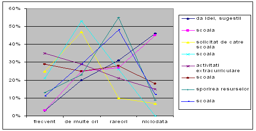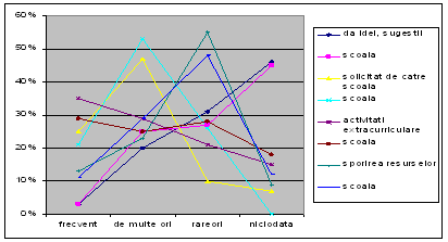 e) Ultimul grup de intrebari aduce referiri la implicarea familiilor in viata scolii, in solicitarea parintilor pentru desfasurarea de activitati in parteneriat, la masura sprijinului oferit scolii de catre familie, la masura curajului in oferirea de idei, sugestii pentru activitatile scol Urmarind graficul realizat se poate concluziona ca exista un numar relative mare de parinti implicvati in sporirea resurselor scolii, aprox. 30%, deci este un manunchi de oameni cointeresati, pe care se poate sprijini scoala. Este mare numarul celor care sunt rar implicati in sporirea resurselor, sau care niciodata nu isi ofera suportul. Acesta dovedeste totusi insuficienta deschidere a parintilor spre scoala, greutatea depasirii barierelor comunicationale dintre familie si scoala mai ales urmarind problema din unghiul de vedere al parintelui. Prezenta la activitatile extracurriculare - concursuri, serbari, excursii, tabere, spectacole ale copiilor, dovedeste interesul parintilor pentru activitati de acest fel, nevoia acestuia de a vedea evolutia copiilor, preferinta pentru activitatile mai lejere, fara constrangeri deosebite, ce relaxeaza si conduc spre inchegarea familiilor si ale colectivelor de parinti. Solicitarile din partea scolii sunt dese, chiar foarte dese, existanmd totusi situatii cand aceste solicitari nu sunt constientizate, datorita deficitelor de comunicare dntre parinti si copii, dntre scoala si parinti, sau alipse de interes pentru aceasta atat din partea cadrelor didactice cat si din partea parintilor. Totusi este bine ca mai mult de 60% din parinti recepteaza si prelucreaza mesajele si solicitarile venite din partea scolii, acest lucru fiind o garantie a implicarii pe viitor a parintilor. Este interesant sa urmarim si evolutia oferirii de ideui si sugestii cscol Se observa aproape o suprapunere a celor doua grafice, ceea ce arata ca se cunoaste foarte bine situatia atat de catre scoala cat si de catre parinti. Este poate singurul graphic care are ascensiune spre ultima variabila - niciodata - datorita lipsei de curaj a parintilor in oferirea de sugestii, idei scolii, a complexarii acestora. Majoritatea parintilor nu ofera idei sau sugestii, dar se implica in viata scol Este de remarcat ca exista un manunchi de parinti 30% - care pot contribui la imbunatatirea vietii educationale a scolii prin idei, sugestii si mai apoi prin suport pentru sporirea resurselor si care pot fi activizati in dezvoltarea de programe si proiecte scoalre si extrascolare. Figura urmatoare ilustreaza grafic cele descrise mai sus.