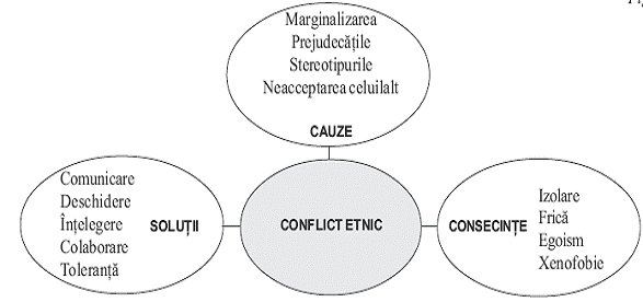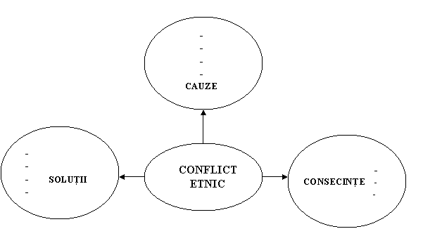 - In interiorul fiecarui cerc de pe schema conflictului respectiv fiecare din subgrupele formate vor incerca sa scrie care ar putea fi cauzele, consecintele si respectiv solutiile ce ar putea duce la rezolvarea conflictului interetnic propus in discutie. |