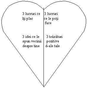 Imaginati-va ca nu aveti nume si nici prenume. Cind s-a nascut fiecare dintre voi ati primit cite un numar - 99721. Asa si se adreseaza parintii, fratii si surorile,prietenii de joaca, profesorii. Cum te vei simti in acest caz? De ce fiecare om are nevoie de Nume si Prenume? Fiecare dintre voi va primi cite o inima ce o veti imparti in patru. In primul colt indicati 3 lucruri ce va plac. In coltul doi- 3 lucruri ce le faci foarte bine In coltul trei- 3 pareri a vecinilor despre tine Iar in ultima parte indica 3 trasaturi pozitive ale tale. Inima indica trasaturile morale si intelectuale ale fiecaruia. Acestea formeaza personalitatea. |