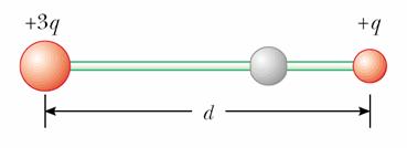 Doua bile metalice de mici dimensiuni avand sarcinile 3q si q sunt fixate la capetele unei tije de sticla de lungime d (vezi Figura). Pe tija culiseaza fara frecare o a treia bila avand sarcina - 3q. La ce distanta de sarcina 3q se va gasi aceasta in echilibru.