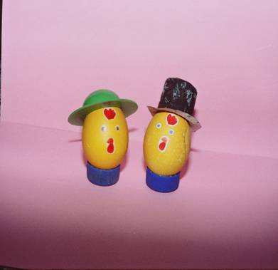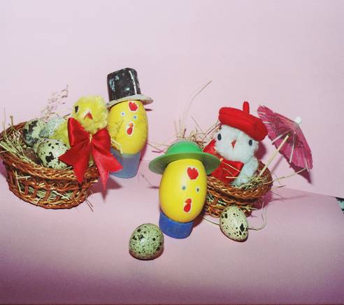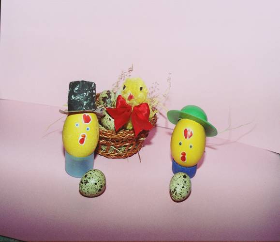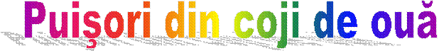 Din coji de oua (golite de continut) realizam puisori. Coaja de ou poate fi necolorata sau o coloram noi cu vopsea pentru oua sau cu acuarele. Ochii, nasul si gura le desenam cu carioca pe coaja de ou sau le realizam din alte materiale (hartie glasata, margele, boabe de piper etc).