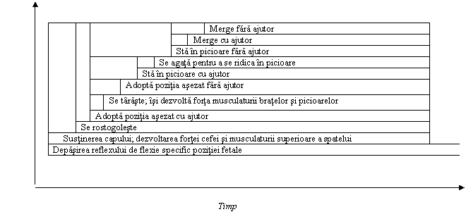Un copil adopta pozitia asezat inainte de a sta in picioare si sta in picioare inainte de a merge. Deprinderile motorii grosiere (mersul si alergarea, de exemplu) se formeaza inaintea celor fine (cum ar fi scrisul). |