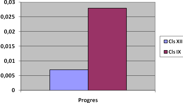 Se poate observa diferența mare dintre rezultatele obținute înainte de pregatire și micșorarea semnificativa dupa perioada de pregatire. La finalul perioadei, clasa a XII-a în continuare pastreaza avantajul fața de clasa a IX-a, diferența fiind însa mult diminuata.