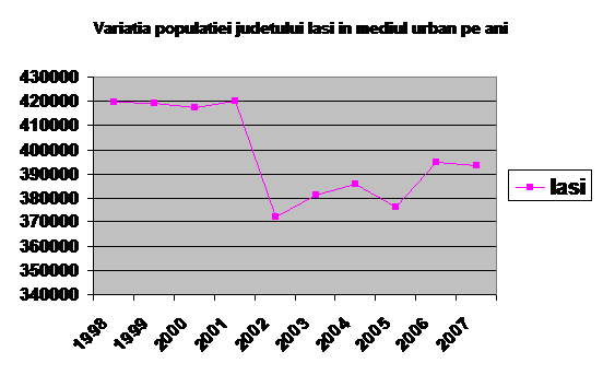 Ponderea populatiei urbane a inregistrat in ansamblu, in intervalul de timp 1998-2005, o descrestere de la 44.13% la 43.58%, datorata migratiei ce a avut loc spre zona rurala, efect al procesului de restructurare industriala din aceasta perioada. In judetul Iasi a avut loc o scadere pronuntata a populatiei urbane de la 50,6% in 1998, la 46,21 in 2005, cu o usoara crestere in 2003-2004. In 2006 cresterea populatiei urbane a fost din nou prezenta, ajungandu-se la un procent de 47,9%. In anul 2007 trendul crescator al populatiei urbane dispare si se evidentiaza o usoara scadere de cca. 0,23 procente, pana la 47,67%. ( Sursa Directia Judeteana de statistica Iasi )