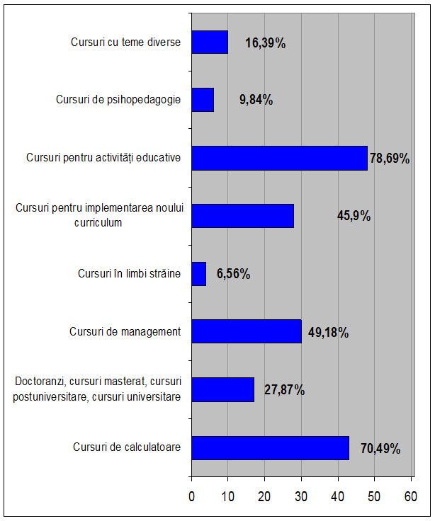 implicarea activa a cadrelor didactice in activitați de perfecționare: grade didactice, cursuri postuniversitare, conferințe, sesiuni de comunicari științifice, doctorate, cursuri de formare in raport cu tendințele de dezvoltare profesionala și ale școlii in vederea imbunatațirii calitații procesului de invațamant.