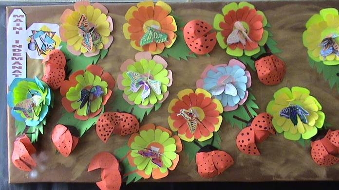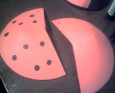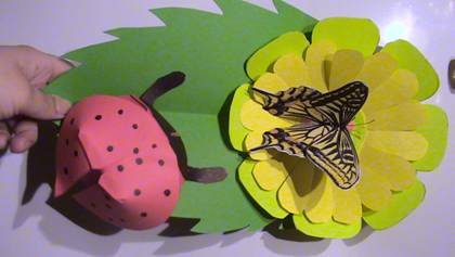 -se coloreaza bulinele negre si capul buburuzei ( din carton se realizeaza corpul, iar din coala, aripile);