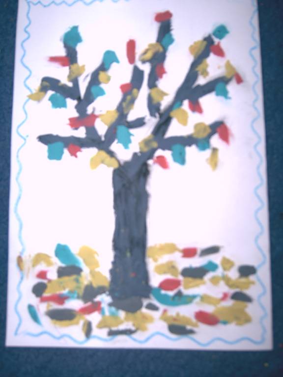 3.-se aplica tot cu degetul plastilina inmuiata pentru frunze (rosie,galbena,verde)
