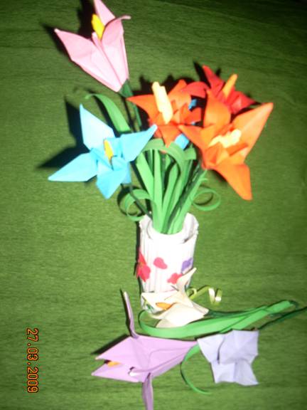 Hartia colorata verde o taiem in forma de triunghi isoscel ,cu laturile foarte lungi,o indoim pe mijloc si o atasam la floare .Cu ajutorul unui creion sau pe muchia de la foarfeca, o rotunjim putin, La un crin putem atasa doua frunze, pe care le lipm in partea de jos a florii.