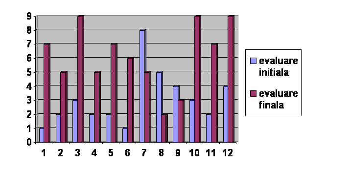 Se poate constata ca valorile ridicate la indicatorii 3, 10, 12, dovedesc o buna adaptare la grup , securizare, comunicare ; la indicatorul 7 valorile s-au mentinut ridicate , aceasta dovedeste o atenuare destul de mica a violentei ; valorile de la indicatorii : 1, 5, 11, dovedesc o buna adaptare la grup dar si exprimare individuala ; diferenta mica obtinuta la indicatorul 9 poate fi datorata agresivitatii dar si faptului ca locuiesc intr-un spatiu larg si exista tendinta de a vorbi pe un ton ridicat .In plus , tonul ridicat nu a fost insotit si de gesturi , mimica agresiva ; inicatorii 2 si 4 semnaleaza faptul ca participantii pot avea initiativa dar sunt capabili si de asertivitate, indicatorul 6 expresivitatea in comunicare este specifica prescolarului mic, exprimarea lui fiind spontana, puternic participativa, lipsita de inhibitii - securizarea in grup a permis exprimarea naturala a copiilor ; indicatorul 8 - atitudinea critica ( la aceasta varsta copilul are o anume " cruzime" in a-si exprima opiniile despre ceilalti, dar se poate voprbi si despre o carenta educativa; copilul criticat tot timpul , va critica si el la randul lui); punctajul obtinut arata ca la nivel de grup, atitudinea critica s-a mai diminuat , dar trebuie sa ramana in atentia parintilor pe viitor.