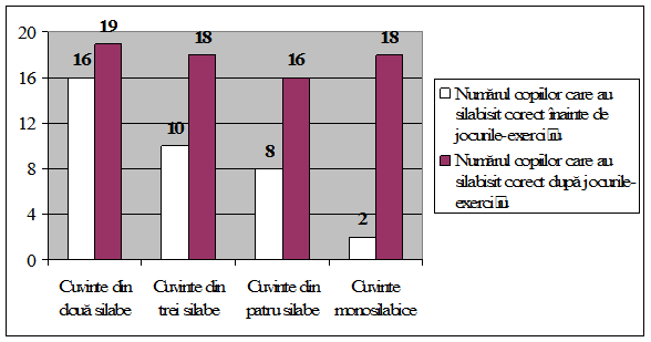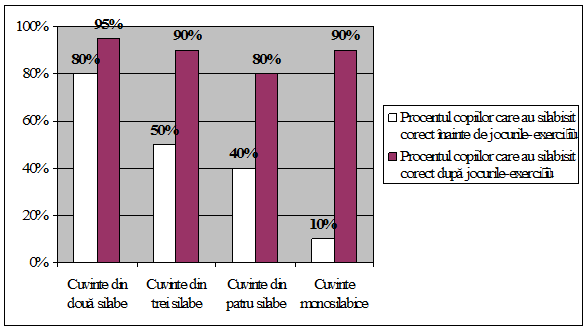 Astfel, la cuvintele alcatuite din doua silabe, au raspuns corect 19 copii din totalul de 20, respectiv 95%, la cuvintele din trei silabe - 18 copii (90%), la cuvintele din patru silabe - 16 copii (80%), iar la cuvintele monosilabice au raspuns corect 18, adica 90%.
