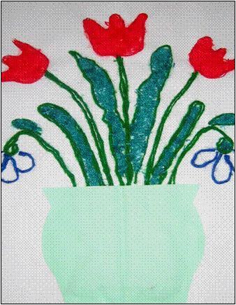 Materiale necesare: carton xerox color (suportul), fire PNA de diferite culori (rosu si albastru pentru flori, verde pentru tulpini si frunze), sablon pentru vaza, creion, aracet, foarfece.