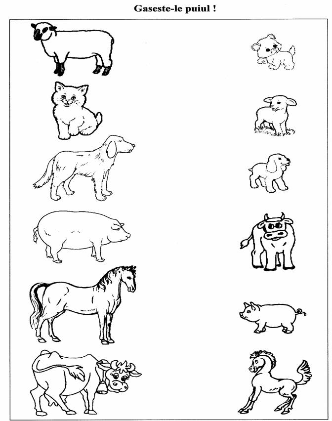 Acum scot animalele din cutie si vreau sa vad daca voi stiti cum se numesc puii lor. Ia sa vedem de exemplu puiul vacii se numeste..(vitel).Formati propozitii cu aceste cuvinte si despartiti in silabe. Vad ca le stiti puii. atunci nu va fi greu sa rezolvati aceasta fisa in care cu o linie uniti mama de pui. Va doresc : ,, Spor la lucru!" Strang fisele si comunic copiilor cine a rezolvat corect fisa. |