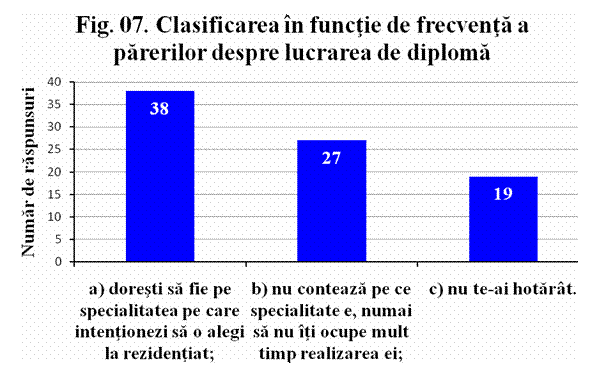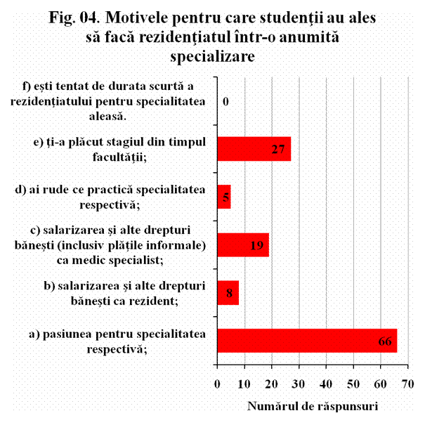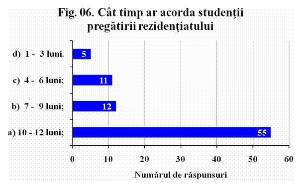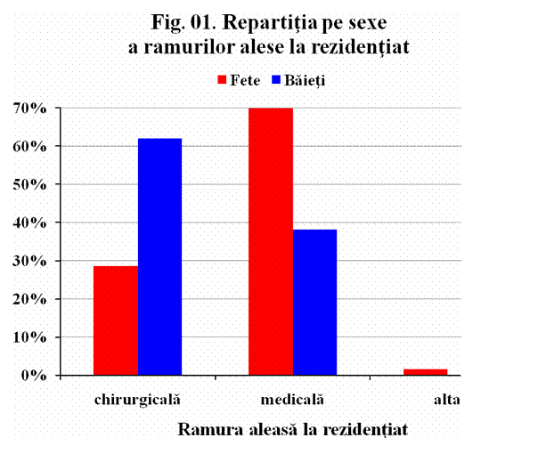 In urma studiului din totalul studentilor care au completat chestionarul, 63 de persoane au fost fete (75% din totalul chestionatilor), iar 21 au fost baieti (25% din total), 94,43% dintre studenti avand varsta cuprinsa intre 22 - 25 de ani, iar 3,57% avand varsta cuprinsa intre 26 - 30 de ani. Un singur respondent a afirmat ca nu doreste sa sustina examenul de rezidentiat pentru ca doreste sa isi contiune activitatea in cercetare. Dintre cei care vor da examenul de rezidentiat 37,35% vor alege o ramura chirurgicala si 62,65% o ramura medicala. In figura Fig. 01. observam repartitia ramurilor alese la rezidentiat in functie de sex si frecventa. Din totalul de 51 de specialitati care pot fi alese la examenul de rezidentiat preferintele studentilor au fost conform graficului de frecventa din figura Fig. 02. Restul specializarilor neincluse in figura nu au fost alese. Tabelul Tabel 1. prezinta situatia optiunilor alternative la rezidentiat in functie de frecventa. 57,83% doresc sa faca rezidentiatul in Romania. Dintre cei care vor sa-l faca in strainatate 34,29% sunt foarte informati in legatura cu formalitatile privind rezidentiatul in afara tarii, 57,14% sunt insuficient informati, iar 8,57% nu sunt informati deloc. Figura Fig. 03. arata repartitia motivelor pentru care studentii au ales rezidentiatul in strainatate. 93,75% dintre ce care vor sa isi faca rezidentiatul in tara si-au ales Bucurestiul ca centru universitar. Figura Fig. 04. clasifica motivele alegerii specializarii la rezidentiat in functie de frecventa. Pentru cei care au raspuns ca alegerea specializarii a depins stagiul omonim s-a reprezentat in figura Fig. 05. repartitia in functie de frecventa a motivul pentru care au agreat stagiul. Figura Fig. 06. descrie distributia studentilor in functie de timpul acordat invatatului pentru examenul de rezidentiat. Figura Fig. 07. arata criteriile dupa care si-au ales studentii lucrarea de diploma.64,6% dintre studenti vor sa ramana in tara dupa terminarea rezidentiatului. 71% dintre studenti vor sa profeseze si in domeniu public si in domeniul privat in acelasi timp. 91,25% dintre studentii interghievati isi doresc sa profeseze in mediul urban. 68,67% dintre studenti si-ar dori sa urmeze cursuri pentru supraspecializare sau pentru o a doua specializare dupa sau in timpul rezidentiatului.