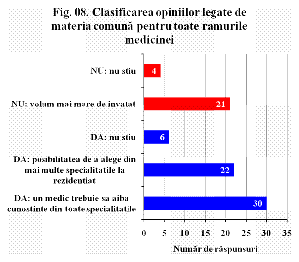 Studentii UMF, Bucuresti sunt constienti de nevoia unei pregatiri medicale temeinice, peste 2/3 dintre ei gasind ca benefica unificarea tematicii de examen pentru toate specializarile. In aceeasi proportie ei isi doresc sa se supraspecializeze sau sa urmeze programe de doctorat, masterat sau cpompetente.