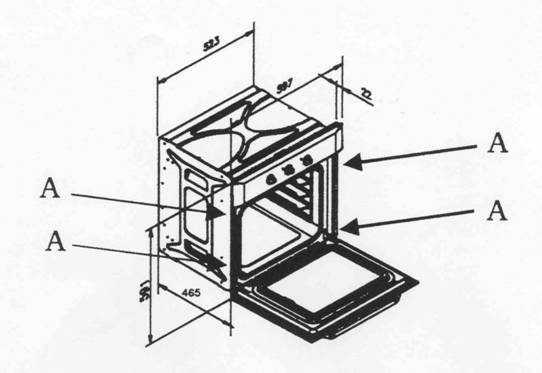 Fixarea cuptorului in cabinet se face cu ajutorul a 4 (patru) holdzsuruburi "A" in colturile ramei pe care se inchide usa.