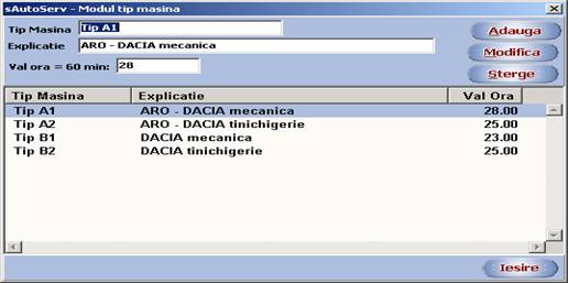 In modulul 'Setvice auto' 'Tip masina.' se trece valoarea pe o ora de lucru care este egala cu 60 minute dupa cum se observa in imaginea de mai jos.