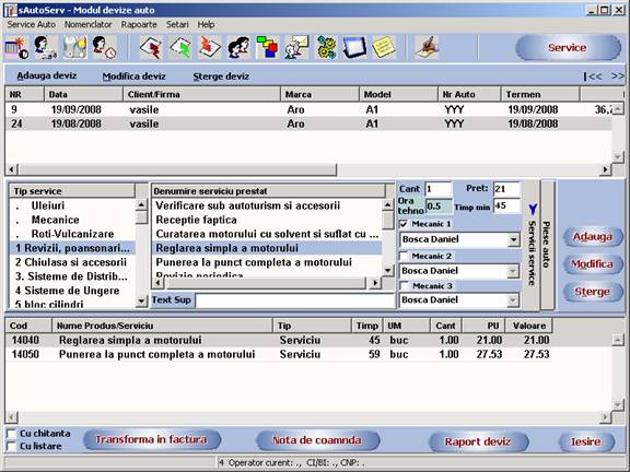 Obs: Pentru ca programul sa realizeze calulul dupa pretul trecut mai sus in modulul care se deschide din meniul Setari Date firma . , in pagina 'Deviz service auto' la elemental 'calulul in deviz se face dupa urmatorul criteriu' trebuie sa fie selectat 'Valoare calculate = timp manopera service x prt tip masina'.