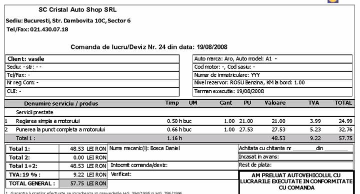 In modulul 'Service auto' 'Deviz lucrare noua.' se poate trece atit timpul normal cit si timpul tehnologic calulul facindu-se dupa tariful trecut in modulul 'Tip Masina.' si dupa numarul deminute trecute la ora tehnologica.