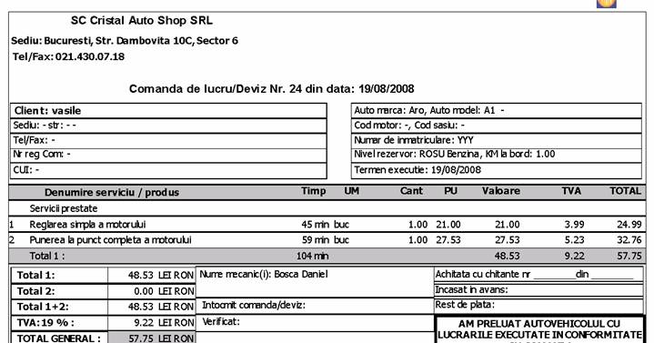 In caz contrar se ia in calcul valoarea care este trecuta in modulul 'Service auto' 'Valori/timp service.' pe tipul de masina folosit