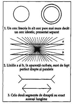 Analiza greselilor de perceptie, a cauzelor acestora, este unul din principalele domenii de cercetare in psihologia cognitiva si, desigur, nu e cazul sa intram aici in prea multe amanunte. Una dintre aceste cauze merita totusi sa fie cunoscuta mai bine, pentru ca este periculoasa si ne afecteaza pe toti. Este vorba de fenomenul numit iluzie cognitiva. Pentru a intelege exact despre ce e vorba, fara a complica lucrurile degeaba, haideti sa ne gandim la un fenomen analog - cel al iluziilor optice. Priviti desenele alaturate: din cauza felului in care sunt construite, ele pacalesc ochiul, acesta devenind incapabil de a evalua corect forma sau marimea unei linii sau a unei imagini. Desigur, fiecare dintre voi le-a vazut deja de multe ori, dar nu le-a considerat mai mult decat o curiozitate amuzanta, fara a se gandi la implicatia lor cea mai importanta: chiar si cand creierul recunoaste, din punct de vedere rational, iluzia, ochiul continua sa perceapa desenul in mod eronat.