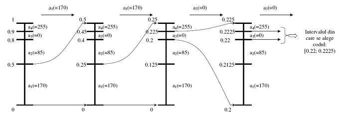 Atunci, latimea fiecarui interval alocat unui simbol ai este data de (pMax-pmin)∙pi, i=1,2,3,4. Observam ca in cazul initial, pMax=1 si pmin=0, obtinem ca si latimi ale intervalelor alocate initial, exact probabilitatile simbolurilor emise de sursa, iar pentru pasii urmatori, aceasta ecuatie ne arata doar ca divizarea intervalului probabilistic curent disponibil se realizeaza proportional cu probabilitatile de aparitie ale simbolurilor individuale.