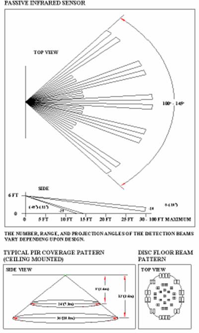 Detectorul PIR este un detector volumetric, in sensul ca supravegheaza un anumit volum al unei incaperi. Principiul de detectie a fost enuntat anterior. Constructiv, dispozitivul are o masca frontala cu lentile Fresnell, prin care senzorul analizeaza in functie de numarul de lentile (12-15 sau chiar mai multe in functie de complexitatea senzorului) fluxurile infrarosii din incapere. In momentul in care un corp cald tranziteaza un astfel de spot, piroelementul genereaza un impuls electric care este analizat si procesat de partea electronica a senzorului. In functie de dispunerea spoturilor se intilnesc senzori cortina, senzori cu spot lung sau senzori volumetrici obisnuiti.