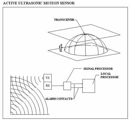 Detectorul activ ultrasonic este un senzor de miscare care emite ultrasunete in spatiul protejat si reactioneaza la schimbarea energiei reflectate. Principiul de detectie are la baza efectul Doppler; un corp in miscare produce o deviatie de frecventa detectata de senzor.