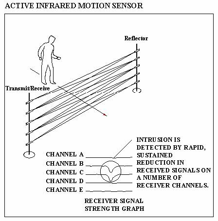 Senzorii IR activi de interior genereaza o cortina de energie IR modulata si reactioneazala o schimbare a modulatiei de frecventa sau intrerupere a energiei IR receptionate. Aceste fenomene se petrec in conditiile in care o persoana violeaza zona protejata.