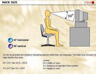 Cele mai "confortabile" unghiuri sub care o persoana poate vizualiza un monitor sau un afisaj sunt pana in 45o pe orizontala si pana la 30o pe verticala. Desigur, ca toti vedem si dincolo de aceste unghiuri, dar fie trebuie sa miscam globul ocular, fie sa indoim gatul, ambele operatii necesitand un efort care se acumuleaza in timp si produce oboseala, prin urmare ineficienta operatorului. De aceea trebuie facut un "efort" de a instala echipamentele in campul acestor unghiuri. ( Am vazut deseori la noi dispecerate prevazute cu multe monitoare mari amplasate la doar cativa centimetrii de ochii operatorului. Pe langa faptul ca distruge vederea acelui om, il si transforma intr-un agent ineficient)
