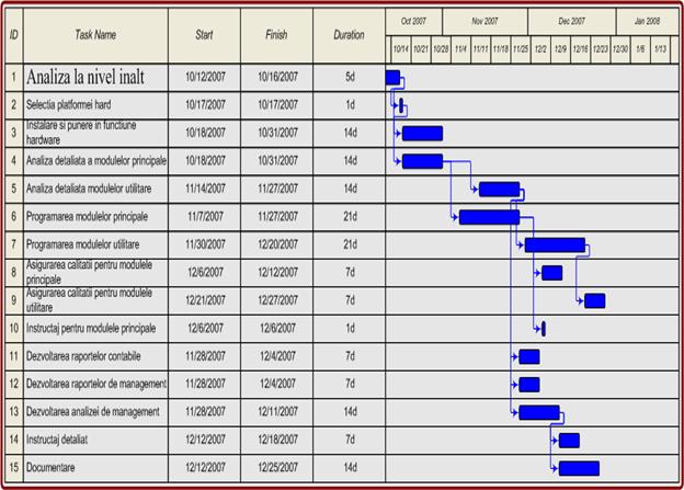 1.Identificarea activitailor din planificare - pentru fiecare activitate se completeaza data de inceput cea mai timpurie; in cazul taskurilor dependende se arata etapele de care acestea depend.