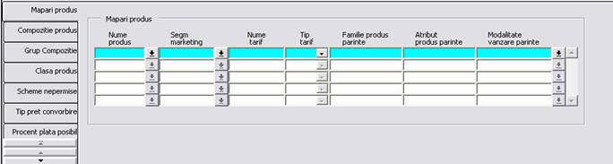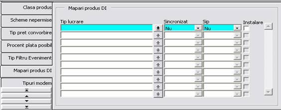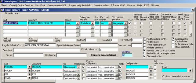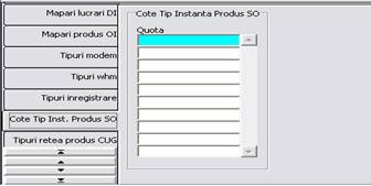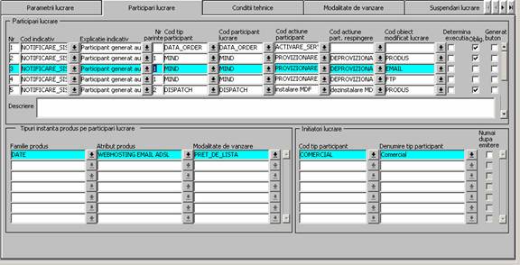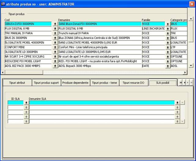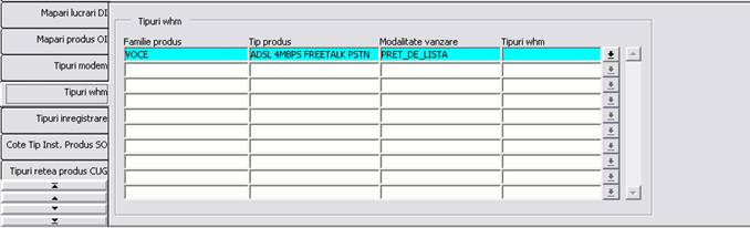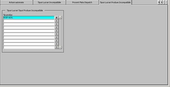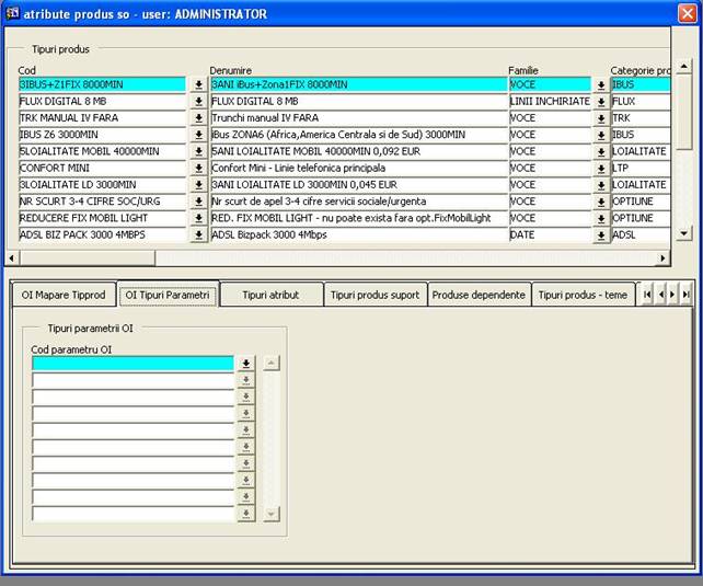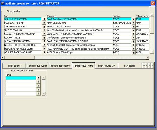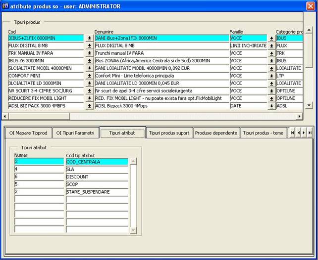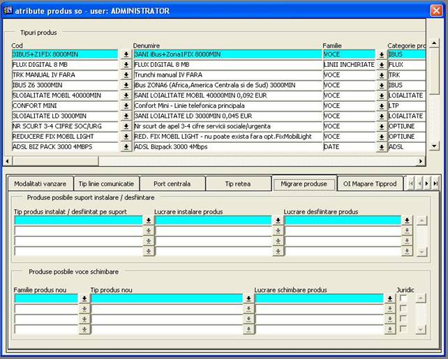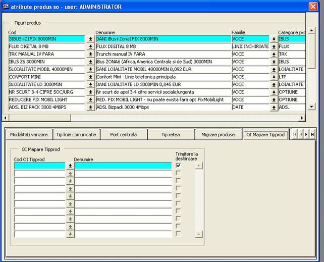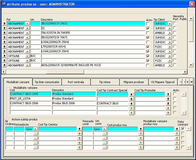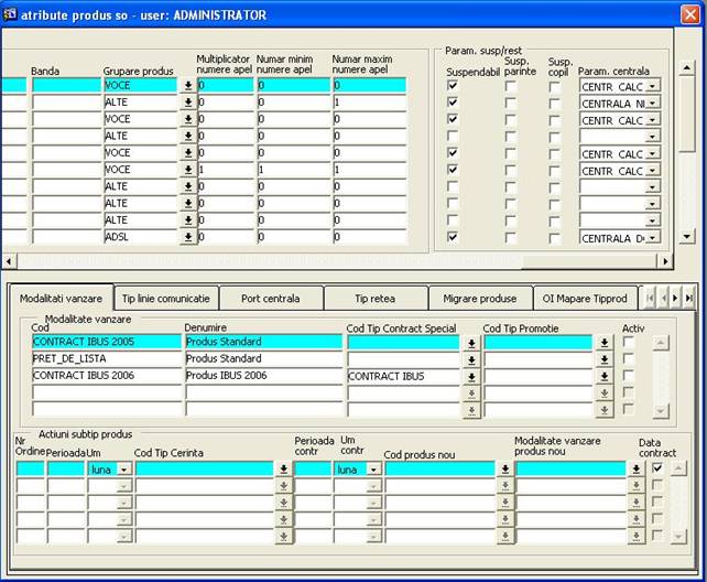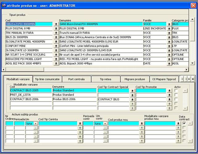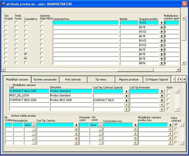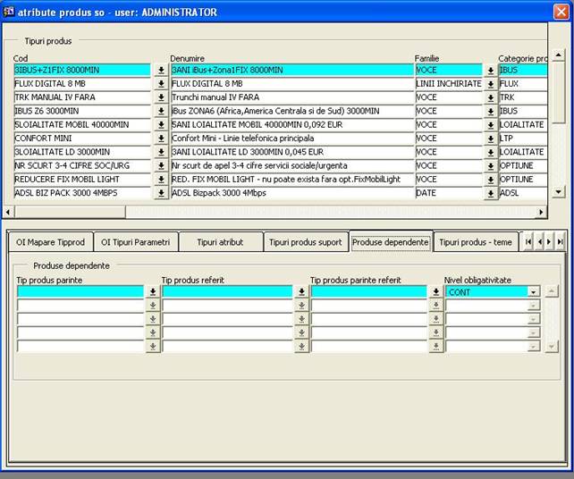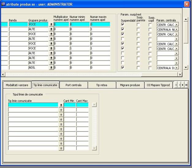 Exista 3 taburi pentru a asigna resursa tehnica; sunt foarte importante, verifica faptul ca un produs se vinde cu o anumita resursa(ex.: un BIZ LINE trebuie sa aiba obligatoriu o linie de comunicatie, un port centrala, si un tip de retea Tip linie comunicatie - specifica tipul liniei de comunicatie posibila pe un produs; un produs poate avea linie de comunicatie in functie de produsul respectiv; de ex.: produsul de abonament Voce 200 poate avea linie de comunicatie LTP. Porturi centrala - un produs de telefonie poate avea unul sau mai multe porturi de centrala la care se poate conecta(de ex.: Voce 200 are portul PSTN, iar produsul TRK D JURIDIC are si tipul de port VIRTUAL). Tipuri retea - specifica tipurile de retea posibile pentru produsul respectiv(defineste tipul de numar); ex.: produsele de voce au tipul de retea TELEFONIE; mai exista si produse care au tip de retea TELE-SPECIALE(numere scurte de 4 cifre). |