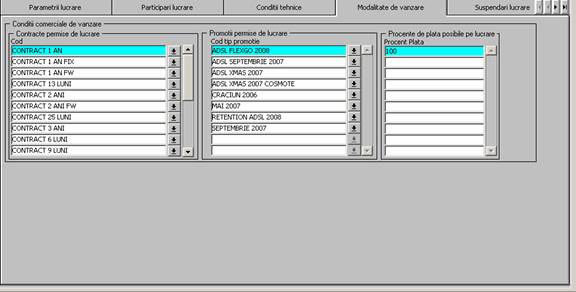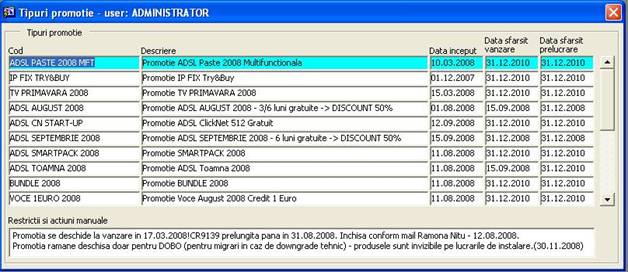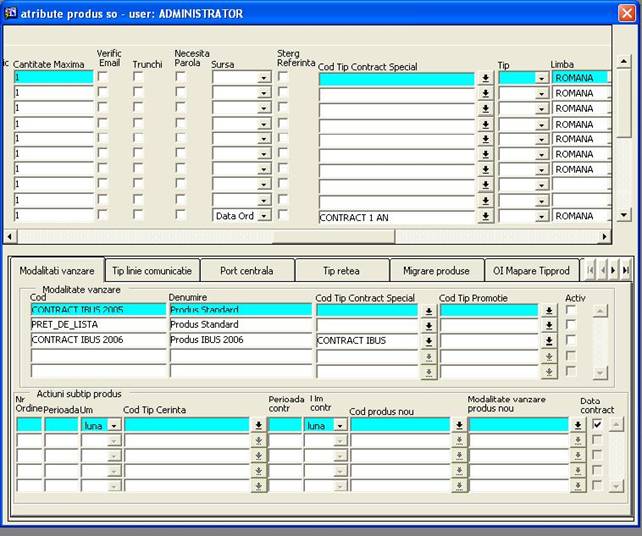 Se insereaza toate variantele/modalitatile de vanzare in functie de cerintele de business; astfel, un produs se poate vinde la pret de lista, cu contract si promotie, sau doar la promotie; pentru orice atribut nou creat(sau atribut care este deja creat, si dorim sa ii adaugam o noua modalitate de vanzare), trebuie sa definim cel putin o modalitate de vanzare(o instanta de produs este valida, daca are o FAMILIE, ATRIBUT si MODALITATE DE VANZARE); Spre exemplu, business-ul poate cere configurarea unui produs cu o anumita promotie, cu un anumit contract; daca cere ca acel produs sa nu aiba nicio promotie, niciun fel de contract special, produsul se configureaza cu pret_de_lista; in schimb, daca businessul cere o promotie care sa dureze o anumita perioada si vrea ca aceasta vanzare sa se faca cu contract special, care sa dureze 1 an, etc, atunci acea modalitate de vanzare trebuie facuta atat cu contract cat si cu promotie(promotia este definita intr-un tabel de promotii in care se specifica cand incepe, cand se termina vanzarea, si cand va fi sfarsitul prelucrarii ei. Astfel, data inceput specifica faptul ca promotia incepe la o anumita data, data sfarsit vanzare este data ceruta de product manager; in momentul in care se termina vanzarea, daca se configureaza un produs cu o promotie expirata, la emitere se genereaza o eroare(s-a terminat promotia); Data sfarsit prelucrare este situatia in care cand se culeg mai multe cereri pe flux(daca nu se termina acele cereri pana la o anumita data, acestea nu se mai pot prelucra; astfel, daca spre exemplu nu s-a reusit instalarea pana la o anumita data, promotia era 'mult prea buna' ca sa mai merite sa ramana in continuare existenta; teoretic, la sfarsitul prelucrarii, ar trebui sa se intample ceva cu cererile de pe flux, insa nu s-a luat nicio decizie in acest sens; daca userul a ajuns pe o astfel de cerere, trebuie sa decida pe moment, singur ce sa faca(poate decide sa ramana pe promotia curenta)) Datorita faptului ca exista multe situatii in care anumiti useri, cu anumite drepturi au dreptul sa mai culeaga anumite cereri, data sfarsit vanzare va trebui pusa mai larga, pentru a-i lasa pe userii respectivi sa mai culeaga. Astfel, s-a gasit o alta modalitate: se completeaza campul descriere cu o denumire corecta, se prelungeste promotia, si se inactiveaza toate modalitatile de vanzare de pe toate lucrarile care le vad userii; raman active(bifa de activ pusa) doar pe lucrarile pe care doar userii permisi pot vedea lucrarea respectiva si doar ei pot sa ajunga la acea modalitate de vanzare. In acest punct, avem un produs care se poate vinde cu contract si promotie. Dupa ce s-a stabilit ca acel produs se vinde altfel decar pret_de_lista, trebuie sa specificam la sectiunea 'Actiuni subtip produs' ce se intampla cu acel produs la sfarsitul contractului(nu avem voie sa ramana in sistem produse cu contracte expirate); Astfel, spre exemplu, pentru produsul 'CONFORT 200', in actiuni, la sfarsitul contractului(pe 1 an), se realizeaza o migrare automata 'SCH TIP ABON DIGITAL PROMO', la 1 an, noul produs 'CONFORT 200' avand noua modalitate de vanzare pret_de_lista. Practic, este asigurat faptul ca acel produs nu ramane in sistem dupa 12 luni. din luna a 13-a produsul poate fi prelucrat de catre orice user, deoarece nu mai este legat de contract. Exista cerinte, care cer ca pe un contract expirat sa se intample un anumit lucru. Prin aceasta modalitate, userul este constrans sa umble doar pe produsele cu contracte expirate, neavand voie sa umble pe contractele active. Daca produsul respectiv este vandut cu contract trebuie ca bifa 'Data contract' sa fie activa, calculul facandu-se in functie de data contractului; In cazul produselor MAXPACK insa(daca avem teme), migrarea se face fara 'Data contract', pentru ca acest MAXPACK se vinde cu promotie fara contract(nu se mai leaga tema de contract, deoarece s-a legat produsul principal); migrarea in acest caz se face de la data 'intrarii' acelui produs(in momentul in care produsul se comite in SO), dupa 30 de zile urmand sa se schimbe in MAXPACK, cu modalitate de vanzare MAXPACK 2007 30 ZILE CU DESF. |
