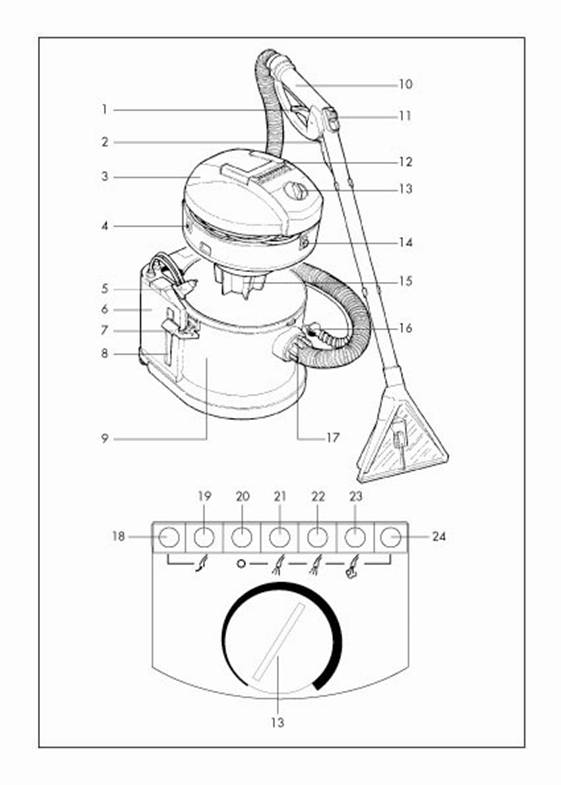 NB. Nu apasati butonul de curatire prin extractie daca in rezervor nu exista detergent sau apa, sau cand aparatul este utilizat pentru curatarea uscata si umeda. In cazul unei utilizari incorecte a pompei (functie activata dar solutia detergent nu ajunge mai mult de 15 min) , un dispozitiv de siguranta opreste functionarea pompei pentru a evita deteriorarea aparatului. In acest caz asteptati in jur de 30 minute inainte de a porni aparatul din nou.