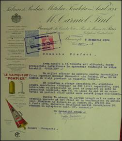 8 noiembrie 1926 - firma Le Vainquer Pompier trimite adresa catre prefectura judetului in care sunt anexate prospecte cu ,,aparate romanesti" de stins incendii" (vezi fig. 1);