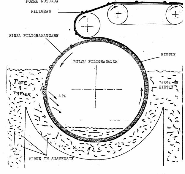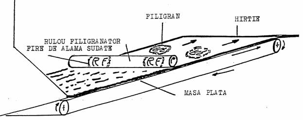 Firele de alama sudate pe ruloul filigranator imprima hartia care se deplaseaza pe masa plata.