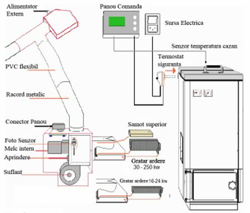 Montati senzorul de supraincalzire pe laterala cazanului si apoi conectati aparatul la panoul de comanda. Acesta va proteja cazanul impotriva supraancalzirii,oprind alimentarea sistemului cu energie electrica.