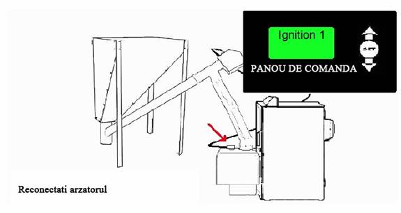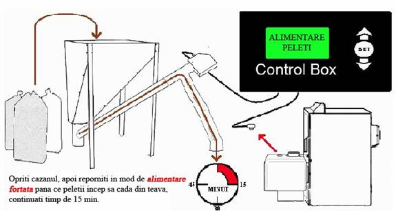Daca rezervorul de peleti s-a golit, sistemul se va opri automat. Pentru a reporni, realimentati rezervorul cu peleti, apoi scoateti sistemul din sursa de 220V iar inainte de reconectare apasati si tineti apasat sageata SUS. Reintroduceti sistemul in sursa 220V. Sistemul va incepe umplerea tevii de alimentare cu peleti. Asteptati pana ce peletii vor incepe sa cada in camera de ardere. Opriti sistemul prin scoaterea stecherului din conector apoi reintroduceti acesta. Sistemul va relua ciclul sau normal de lucru care i-a fost setat anterior.