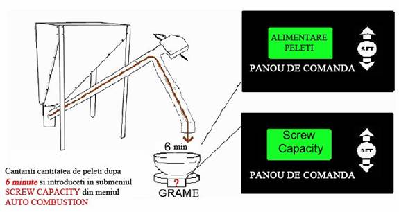 Capacitatea melcului este exprimat in grame si defineste cantitatea de pelete ce poate fi alimentat de motorul de alimentare in 6 minute.