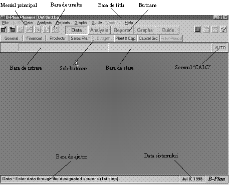 Aceste butoane reprezinta principalele elemente de meniu din B-Plan, denumite Data, Analysis, Reports, Graphs si Guide. Apasarea unui buton va face ca sub-butoanele sa se modifice, aparand cele corespunzatoare elementelor de submeniu legate de elementul de meniu principal ales. Apasarea unui sub-buton va activa elementul de submeniu cerut.