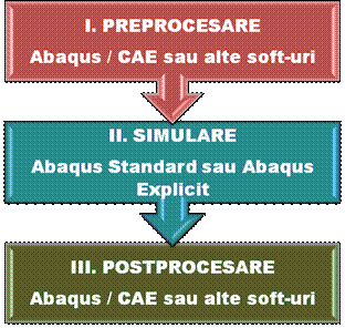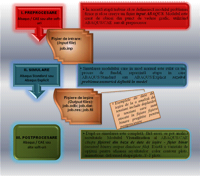 O modelare completa in Abaqus in cazul unei strucruri mecanice, consta de obicei in trei etape distincte: etapa de preprocesare, simularea si postprocesarea (fig. 1). Aceste trei etape sunt legate prin fisiere.