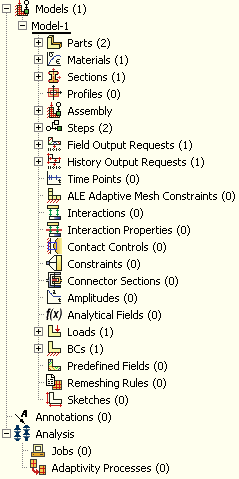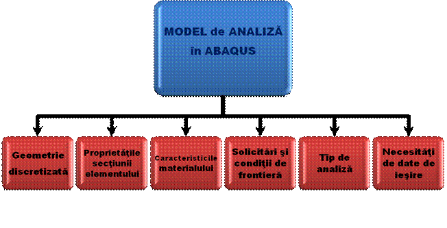 Un model in Abaqus are cateva elemente componente care descriu impreuna problema fizica care va fi analizata si rezultatele obtinute. Modelul de analiza numerica consta din urmatoarele informatii: geometrie discretizata (impartita in elemente finite), proprietati de sectiuni de elemente, date de material, solicitari (loads) si conditii de frontiera (boundary conditions), tip de analiza (analysis type) si date necesare de iesire (output requests).