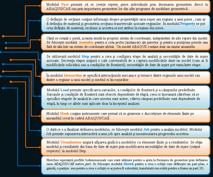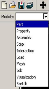 ABAQUS/CAE este impartit intr-un set de module si fiecare modul permite sa se lucreze asupra unui aspect al modelului. Lista Module din bara contextuala permite comutarea intre aceste module. Alte elemente din bara contextuala sunt in functie de modulul in care se lucreaza.